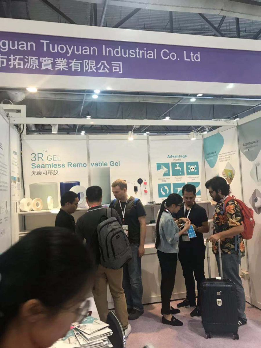拓源无痕可移胶厂家于2018年10月18-21日参加香港电子展取得圆满成功。无痕可移胶厂家拓源公司在展会上吸引了不少国内外客户,得知可移胶的重复使用,可移动,可水洗,无残无痕的特点后。纷纷要求我们可移胶专家们为自己的产品给出解决方案。提升自己的产品逼格。这次展会的主要针对电子产品,有音箱、VR、移动电源、无线充坐等。
